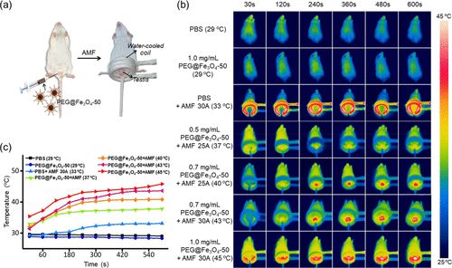 图2. (a) 通过睾丸注射给药对小鼠模型进行热避孕治疗的示意图;(b) 注射 PEG@Fe3O4-50 的小鼠睾丸的热红外图像;(c) 随时间测试处理小鼠的温度。