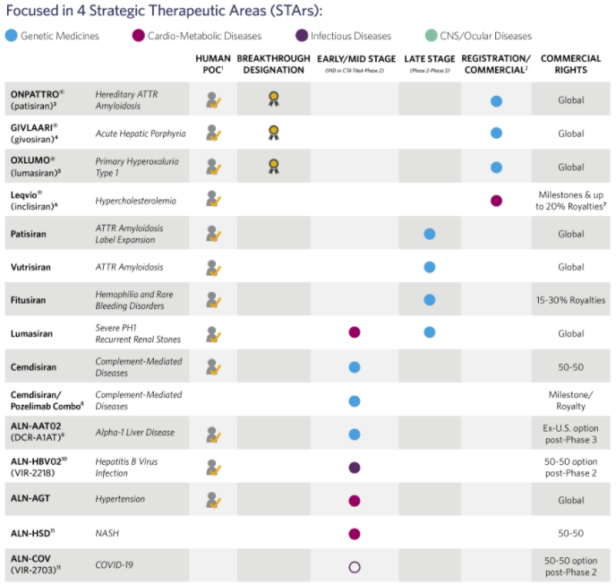目前,Alnylam公司的研发管线已经覆盖遗传疾病、心脏代谢疾病、肝感染性疾病,以及中枢神经系统(CNS)和眼部疾病领域。