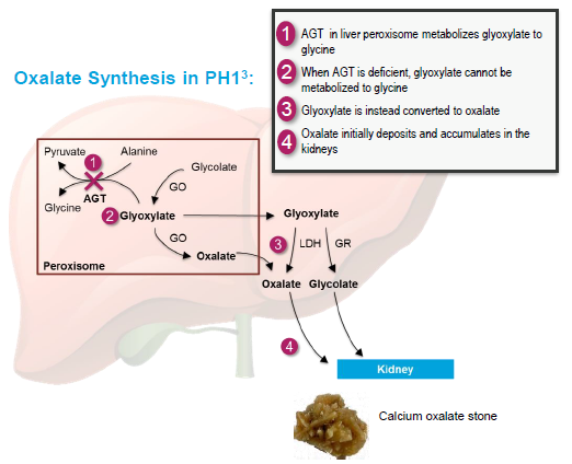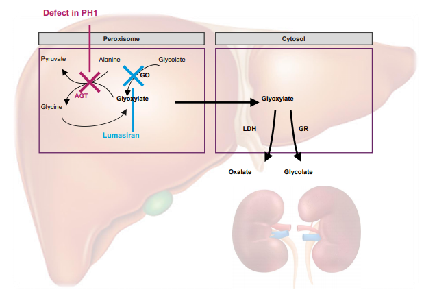 原发性高草酸尿1型(PH1)是一种非常罕见的遗传性疾病(发病率百万分之一到百万分之三),由AGXT基因突变引起机体乙醛酸-氨基转移酶(AGT)缺乏。AGT可以催化乙醛酸转化为甘氨酸。当AGT活性缺失时,乙醛酸转化为草酸,形成不溶性草酸钙晶体。过多的草酸盐会导致肾脏和其他器官中积累不溶性钙盐,导致进行性器官损伤。草酸钙在肾脏的积聚可能导致肾结石和进行性肾衰竭。尿路沉积物可导致排尿困难、尿中有血和反复尿路感染。其他身体组织中的不溶性钙沉积可导致骨痛、视力下降、刺痛、麻木或四肢疼痛、肝脾肿大以及心脏系统问题(心脏传导阻滞)。