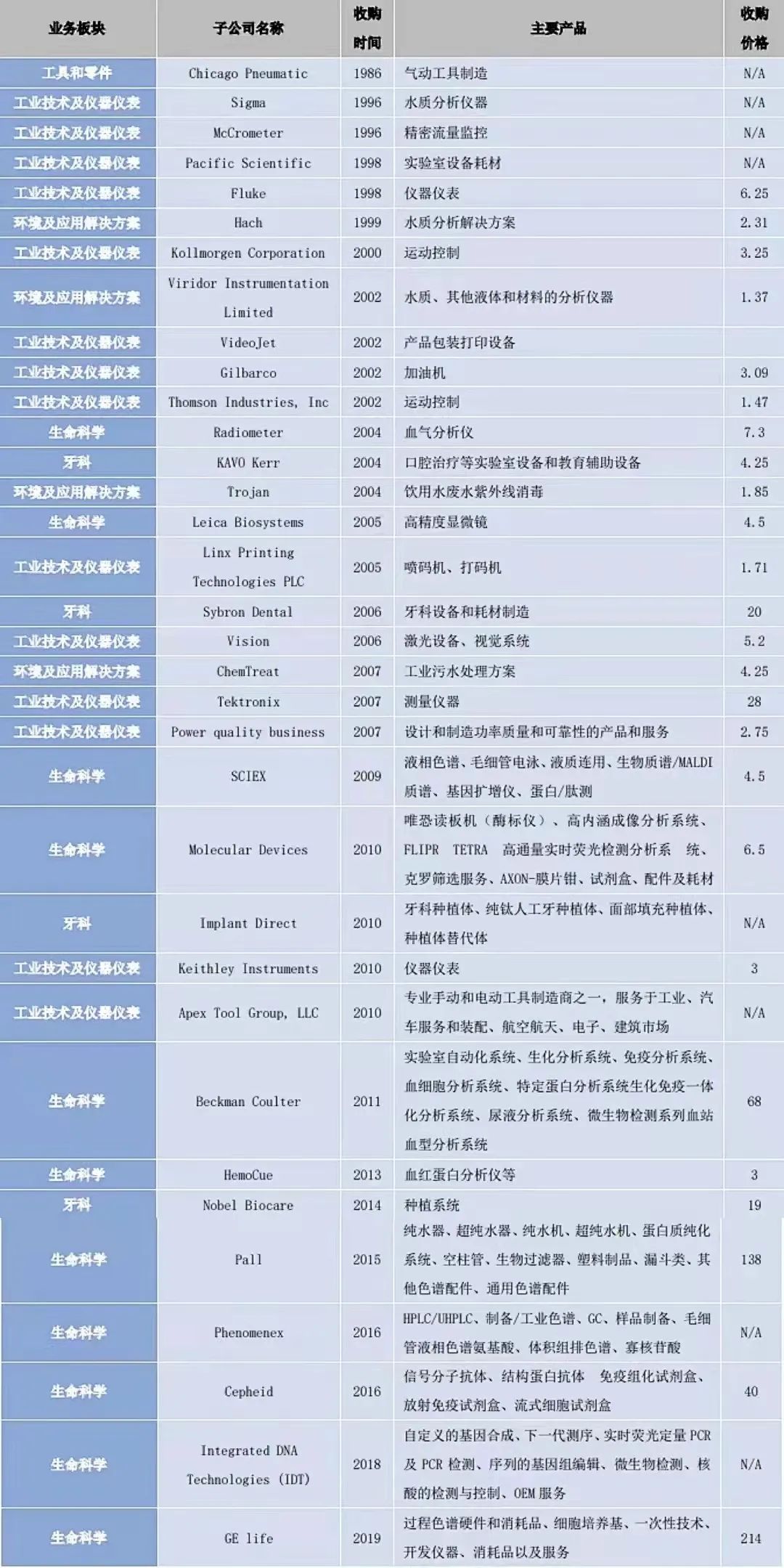 2015年,丹纳赫斥资138亿美元收购过滤、分离、纯化技术公司Pall Corporation,成为目前为止全球唯一一家自主生产所有滤材的过滤器公司。2019年,丹纳赫斥资214亿美元收购通用电气公司旗下GE生命科学公司(GE Life Sciences)的GE生物医药(GE Biopharma)业务。交易于2020年完成,该业务部门更名为Cytiva(思拓凡),成为丹纳赫的重要运营公司之一。