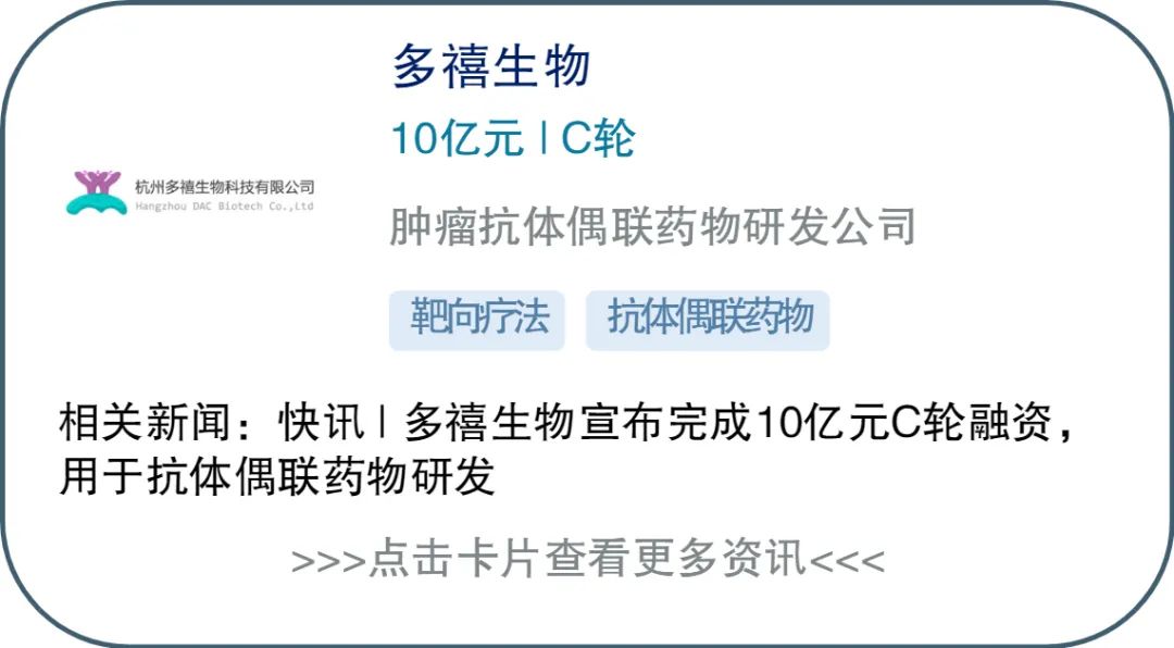 目前众多公司正在积极布局抗体偶联药物(ADC)管线。5月8日,杭州多禧生物宣布近期完成了10亿人民币的C轮融资,用于ADC创新药物的研发。本轮融资由高瓴创投、晨岭资本、CPE联合领投,中信证券,泰煜投资和嘉华国际基金等机构跟投。