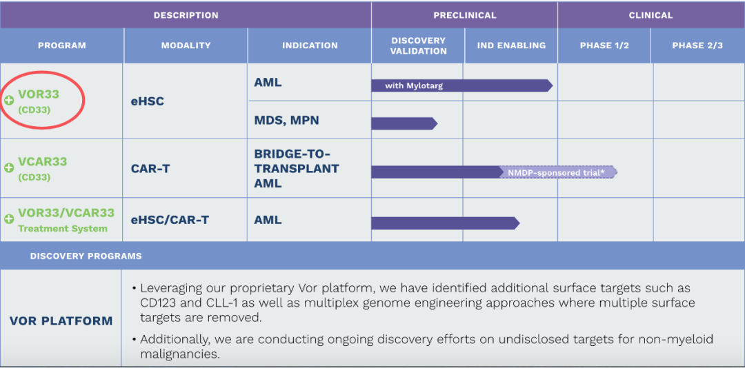 这个VOR33就是他们的工程细胞化干细胞,旨在替代干细胞移植的标准治疗。Vor使用基因组工程技术从干细胞中去除CD33表面靶标,产生VOR33。