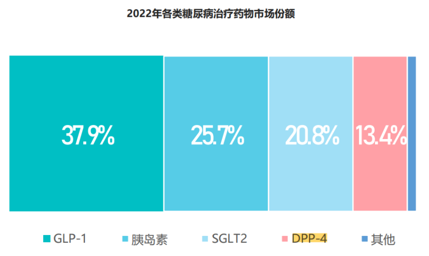2022年,降糖药市场,排名前四的分别是GLP-1激动剂、胰岛素、SGLT-2抑制剂、DPP-4抑制剂,2022年,全球DPP-4抑制剂销售额约为79.6亿美元,占20.8%。