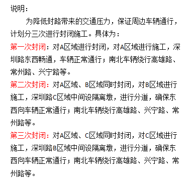 因道路改造工程施工需要,2021年12月10日至12月30日,对深圳路与和阳南路交叉口实行半封闭施工,请车辆、行人绕行,注意交通安全。