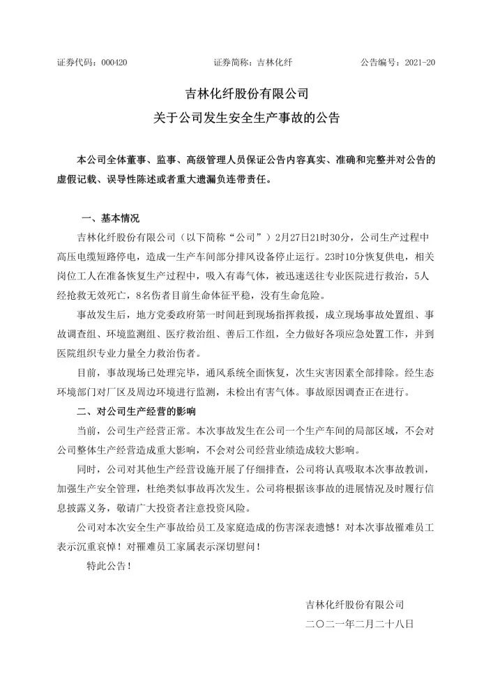 发生事故的吉林化纤公司为A股上市公司,是我国大型化纤支柱企业,也是当地知名企业。去年工业产值94亿。