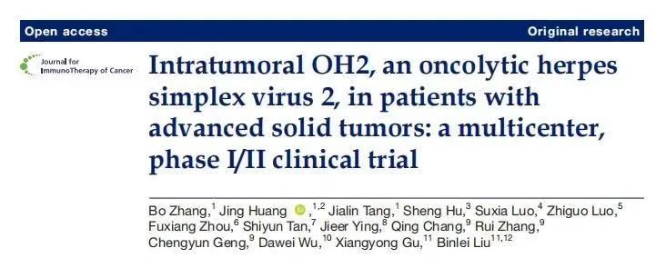 2021年4月,由中国医学科学院肿瘤医院黄镜教授牵头的溶瘤Ⅱ型单纯疱疹病毒OH2注射液国内多中心临床研究结果发表在Journal for Immuno Therapy of Cancer,文章《Intratumoral OH2, anoncolytic herpes simplex virus 2, in patients with advanced solid tumors: a multi-center, phase 1/2 clinical trial》公布了OH2作为单一药物或与抗PD-1抗体HX008联合应用于晚期实体瘤患者的安全性、耐受性和抗肿瘤活性的临床试验结果。