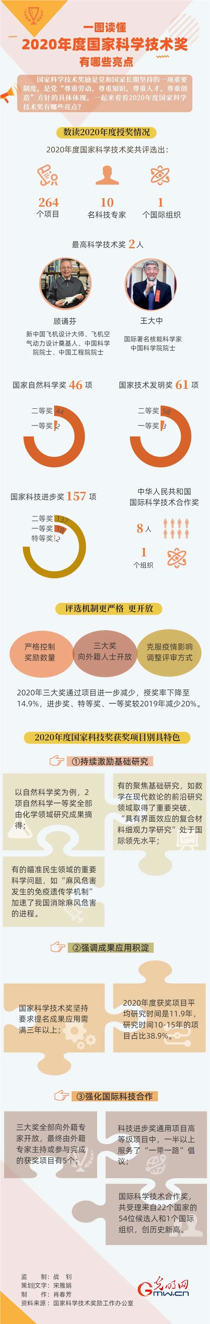 根据《国家科学技术奖励条例》的规定,经国家科学技术奖励评审委员会评审,国家科学技术奖励委员会审定和科技部审核,国务院批准并报请国家主席习近平签署,授予顾诵芬院士、王大中院士国家最高科学技术奖;国务院批准,国家自然科学奖授奖项目46项,其中:一等奖2项,二等奖44项;国家技术发明奖授奖项目61项,其中:一等奖3项(通用项目1项,专用项目2项),二等奖58项(通用项目43项,专用项目15项);国家科学技术进步奖授奖项目157项,其中:特等奖2项(专用项目2项),一等奖18项(通用项目10项,专用项目7项,创新团队1项),二等奖137项(通用项目110项,专用项目27项);授予8名外籍专家和1个国际组织中华人民共和国国际科学技术合作奖。