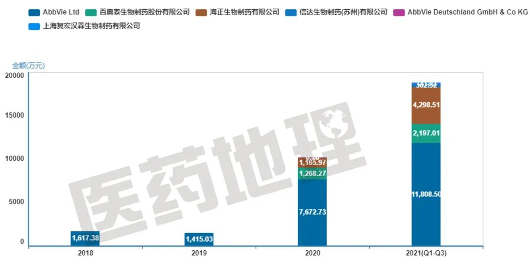 △图3 阿达木单抗各生产企业历年(2018-2021Q3)销售增长分析