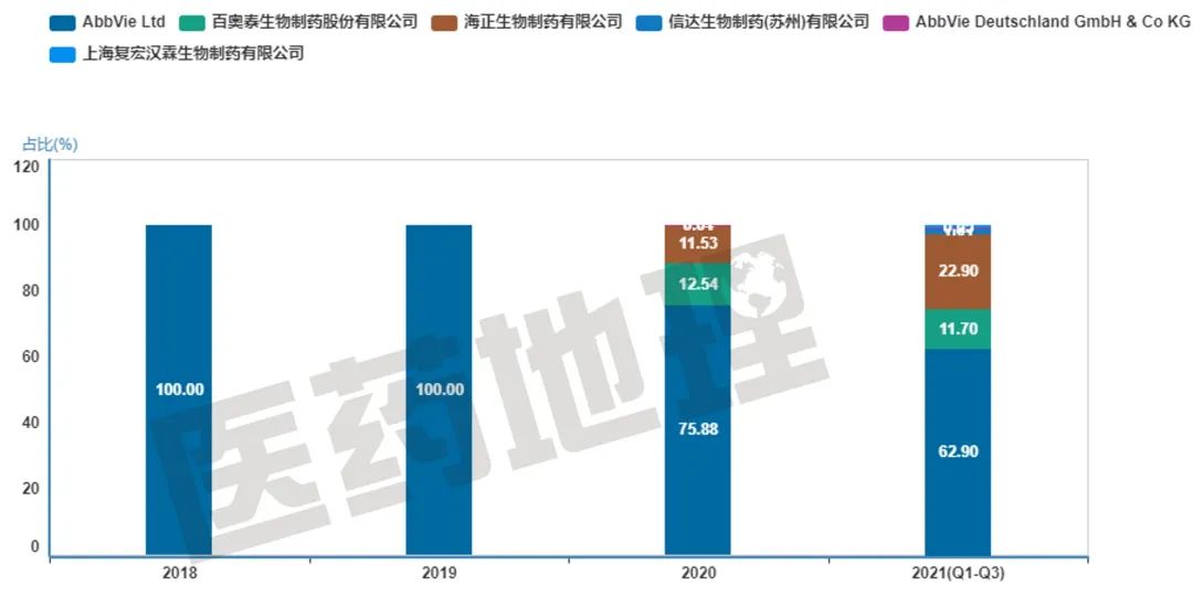 △图4 阿达木单抗各生产企业历年(2018-2021Q3)销售占比分析