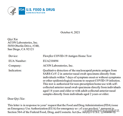 同日10月5日下午(美国时间),华尔街日报报道,FDA批准了第7家新冠抗原自检试剂,来自于中国艾康生物技术的Flowflex COVID-19 Home Test。