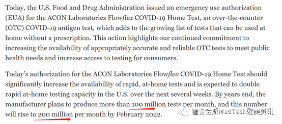 这是第一个来自中国的IVD企业获得FDA新冠抗原自检试剂EUA的批准。根据FDA的官方报道,艾康将在未来的几个星期,把美国的抗原自检试剂供应量提高一倍,在2021年底达到一个月1亿份试剂产能,在2022年2月份实现一个月2亿份试剂的产能。