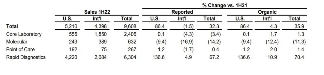 雅培:营收96亿美元,与罗氏诊断已相当接近。2022上半年,快速诊断业务持续发力,在去年的超高增速(+245.7%)之上继续攀升67.2%,达63亿美元,带动了整体高增长。