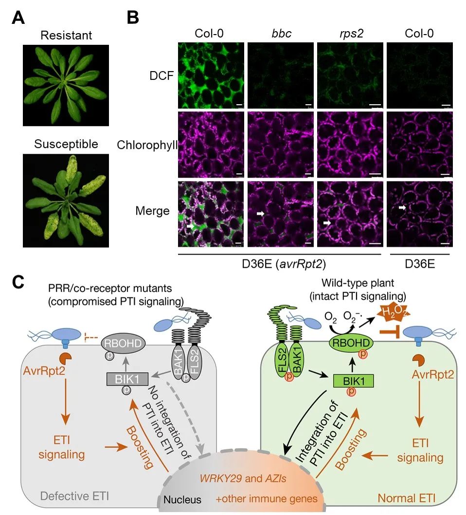 图A.上图为抗病植物表型,下图为感病植物表型。图B.不同菌处理植物后,活性氧ROS的产生情况。D36E(avrRpt2)菌株在野生型Col-0植物中能同时激活PTI和ETI。绿色荧光指示活性氧ROS,紫色荧光代表叶绿体自发荧光。图C.文章研究结果的模型图。图中右边表示正常植物,能够同时激活第一层PTI和第二层ETI免疫系统,因此存在协同作用,抵抗病原菌的侵染;左边是第一层免疫系统PTI缺失的突变体,不能诱导起正常的ETI免疫反应,从而缺失了植物抗性。