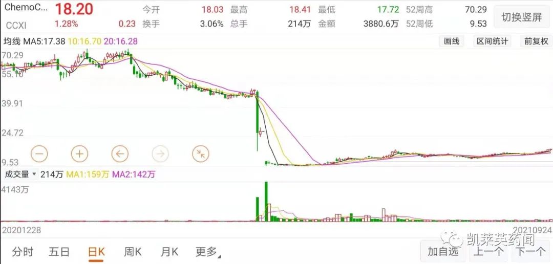 虽然此后,ChemoCentryx股价一路上涨,每股从最低点9.55美元上涨至18.2美元,但至今与暴跌前的48美元每股仍相差甚远。