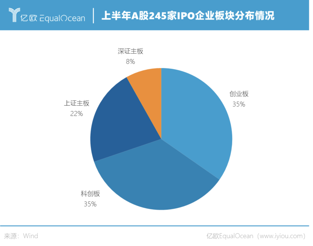从上半年IPO的245家企业分布板块来看,科创板和创业板在推动企业进入资本市场方面发挥了关键作用。在科创板和创业板上市的企业分别有86家和85家,合计171家,占IPO企业总数近七成(69.80%);募集总额1235.57亿元,占比58.57%。