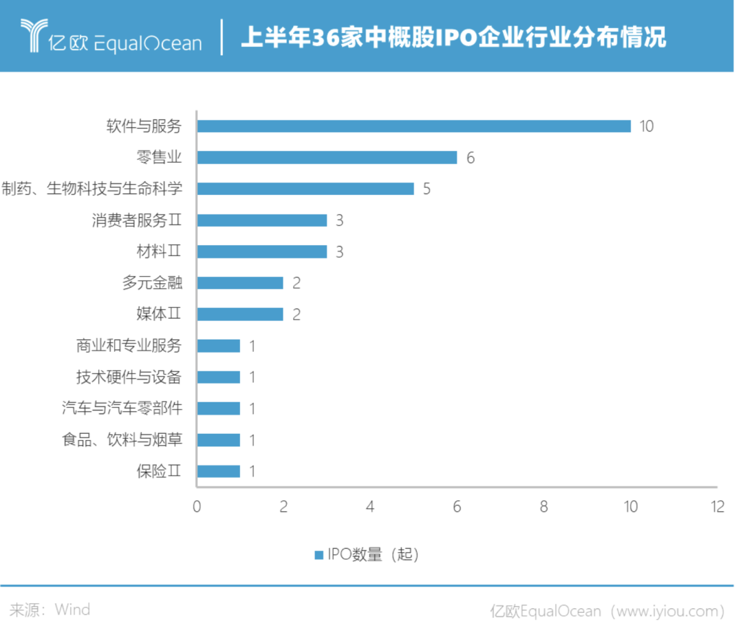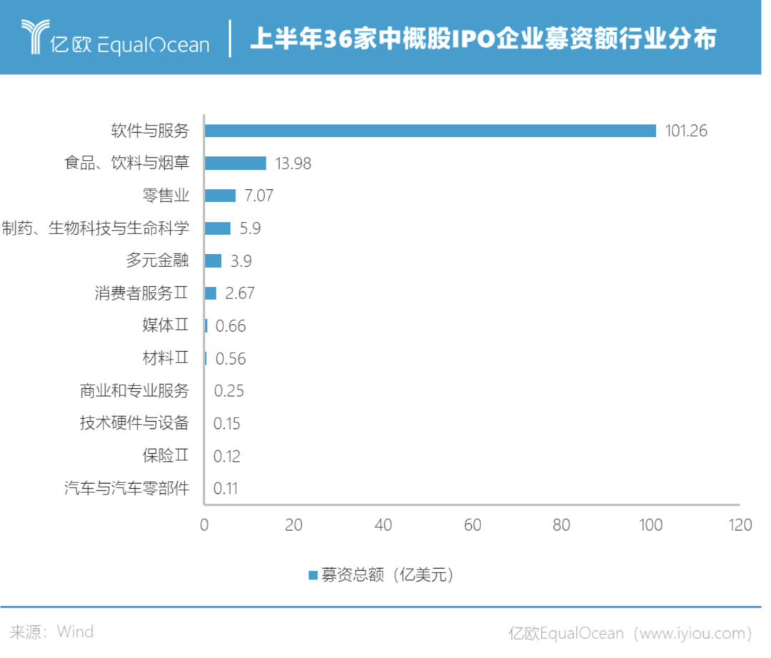 上述明星企业均位列2021年上半年中概股募资额前十。从行业分布来看,融资额前十主要集中在软件与服务行业,共有7家;食品、饮料与烟草,多元金融,零售业各1家。