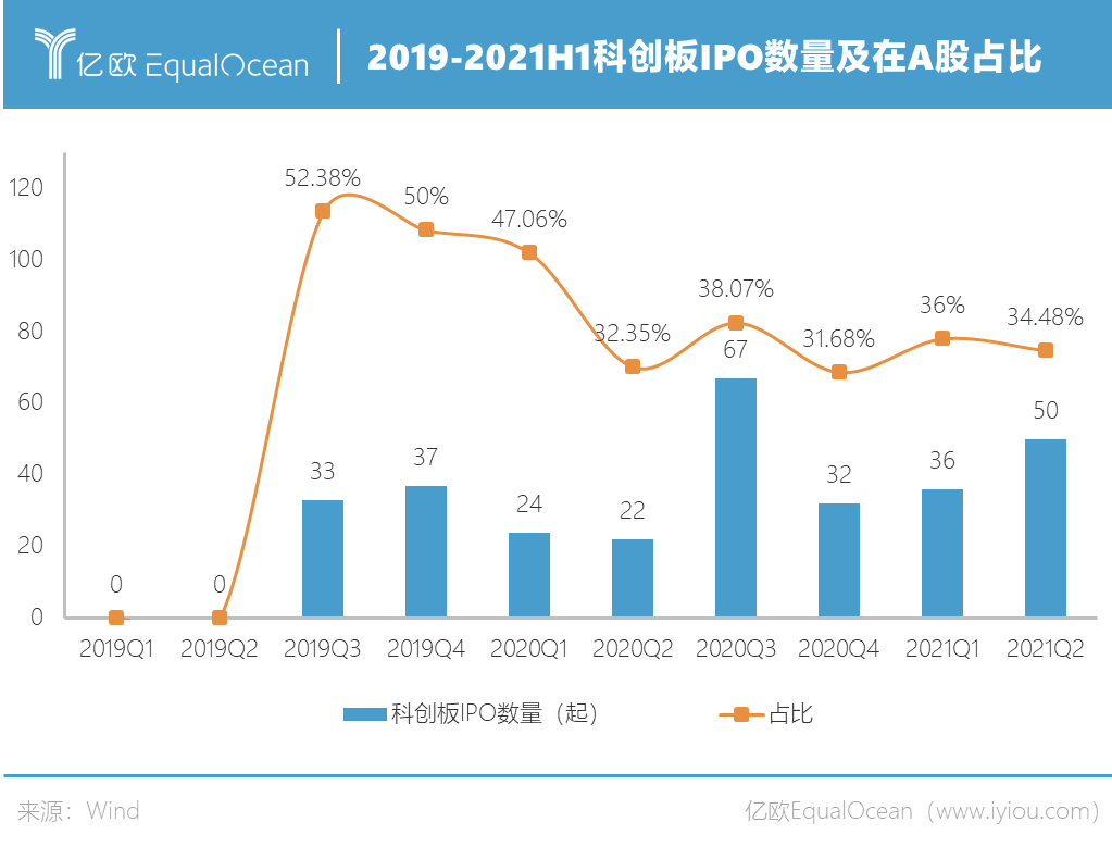 其实自2020年第三季度以来,科创板和创业板就成为企业A股IPO的主要发力板块。2020年Q3-2021年Q2,科创板和创业板IPO总数为118家,60家,69家和102家。占比分别为67.05%、59.41%、69.00%、70.34%。