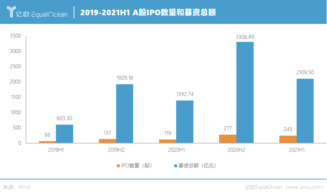 2021年上半年,A股沪深两市共有245家企业上市,较2020年同期增加了126家,同比增长105.88%。首发募资总额达到2109.50亿元人民币,较2020年同期增长51.46%。
