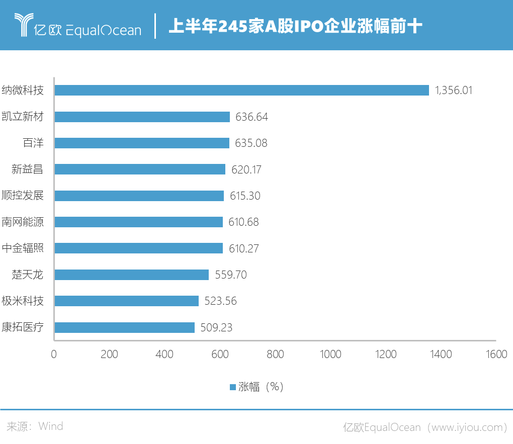 其中,6月23日登陆科创板的微纳科技上市以来涨幅高达1356.01%,该企业属于制药、生物科技与生命科学板块。该板块2021上半年有18家企业上市,其中有17家来自科创板,上市以来平均涨幅超281%。