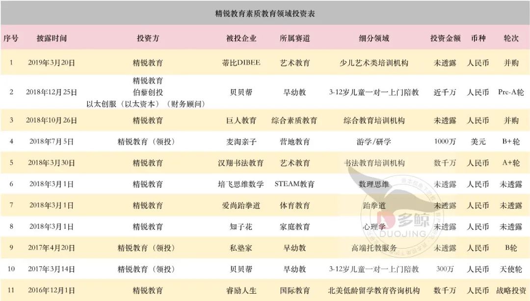 2016 年至今,精锐教育总共公布了 11 起素质教育领域投资事件,覆盖早幼教、艺术教育、体育教育、营地教育、国际教育、STEAM 教育等多个细分赛道,其中