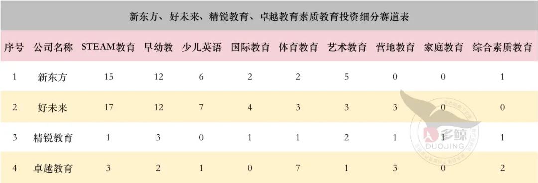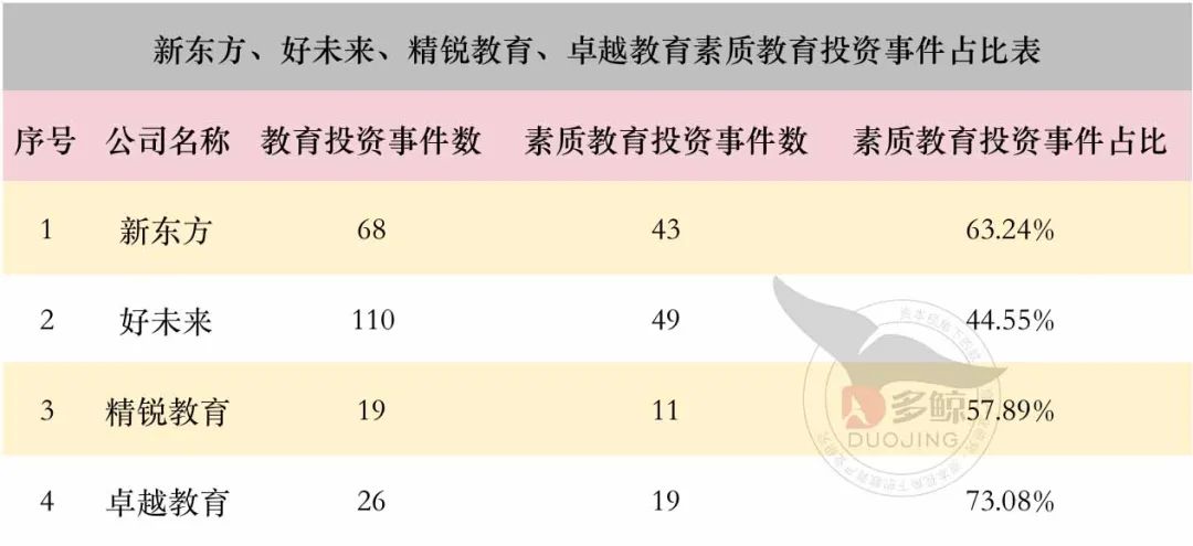 一言以蔽之,从素质教育投资事件占比分析来看,卓越教育素质教育的投资力度最大,新东方次之,精锐教育、好未来力度偏弱。