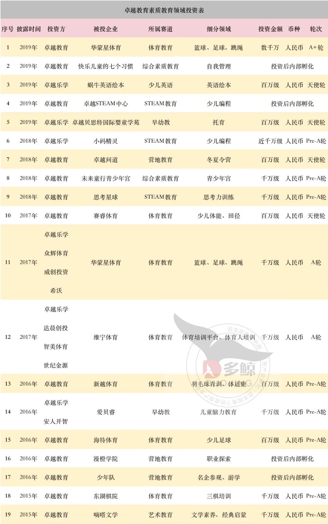 卓越教育于 2015 年,也早有投资动作「落子」素质教育。据不完全统计,卓越教育在素质教育领域共有 19 起投资,涵盖了体育教育、早幼教、STEAM 教育、少儿英语、营地教育、艺术教育和综合素质教育多条细分赛道。值得注意的是,卓越教育重点布局体育教育赛道,投资了赛睿体育、华蒙星体育、东湖棋院等 6 家体育教育培训机构,复投华蒙星体育 1 次,其重视程度可见一斑。