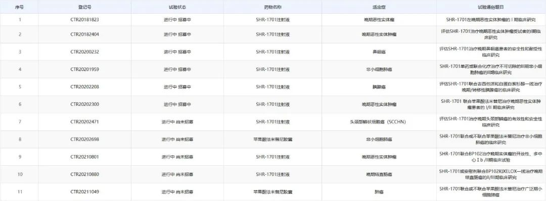 2021年5月12日,恒瑞PD-L1/TGFβ双抗SHR-1701申报又一临床项目,截止目前,SHR-1701已进入临床的项目已达14个,其中在我国进行的有11个。