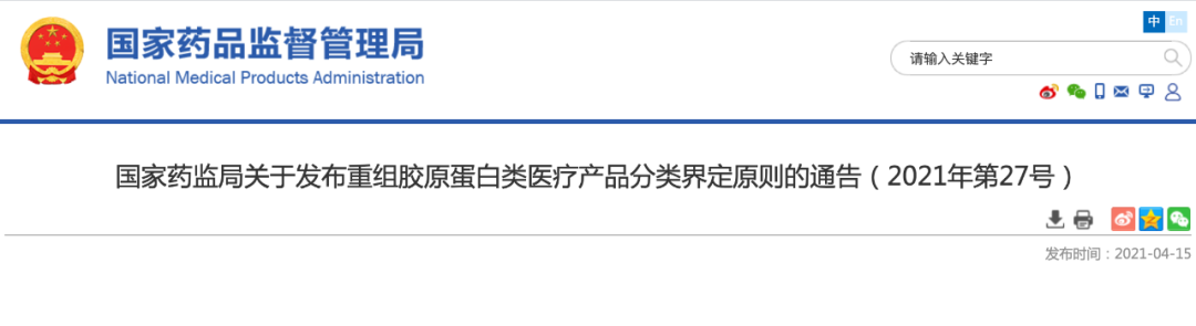 国家药监局关于发布重组胶原蛋白类医疗产品分类界定原则的通告(2021年第27号)