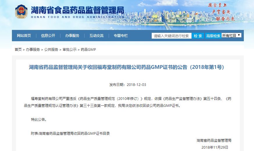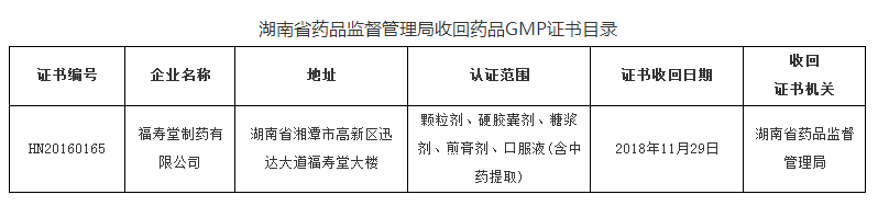 12月3日,湖南省药品监督管理局发布一条关于“收回福寿堂制药有限公司药品GMP证书”的公告。