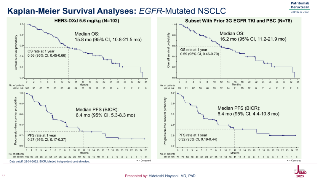 在2023年日本肿瘤内科学会(JSMO)年会期间,第一三共已经公布了HER3-DXd两项早期临床试验数据(肺癌U31402-A-U102,乳腺癌U31402-A-J101),其中对包括78名患者既往接受过三代EGFR-TKI以及含铂化疗的102名接受HER3-DXd推荐剂量(5.6mg/kg)治疗的EGFR突变NSCLC患者汇总分析结果显示,HER3-DXd在中位随访23个月(11.8-36.0个月)内,客观缓解率(ORR)达到40.2%,疾病控制率(DCR)为78.4%,缓解持续时间(DOR)为7.6个月,无进展生存期(PFS)为6.4个月,总生存期(OS)为15.8个月。