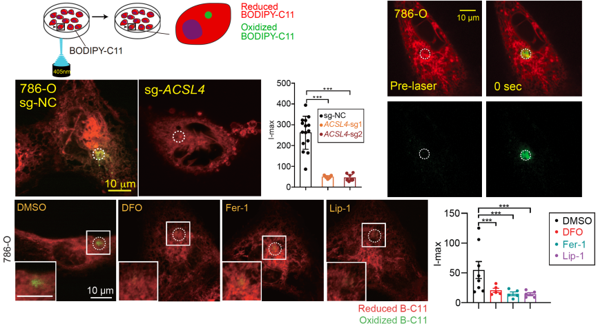 据悉,该研究使用 BODIPY-C11 作为 PALP 信号的分子指示剂。邹贻龙坦言,对于脂质过氧化指示剂其实没有太多选择余地。目前,可指示脂质过氧化的指示剂只有两种,BODIPY-C11 是其中一个,且已实现商业化,其稳定性和敏感性都比较高,价格也比较便宜。