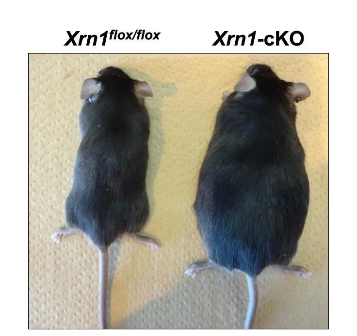 有意思的是,XRN1在下丘脑中有着表达。为了理解它的相关生理作用,研究人员们在小鼠的下丘脑部位选择性地干扰Xrn1基因,使其无法产生XRN1蛋白。仅仅过了六周,这些小鼠就开始发胖。而十二周后,缺乏XRN1的小鼠更是达到了肥胖的标准。脂肪也在它们体内到处积累,填满了肝脏。