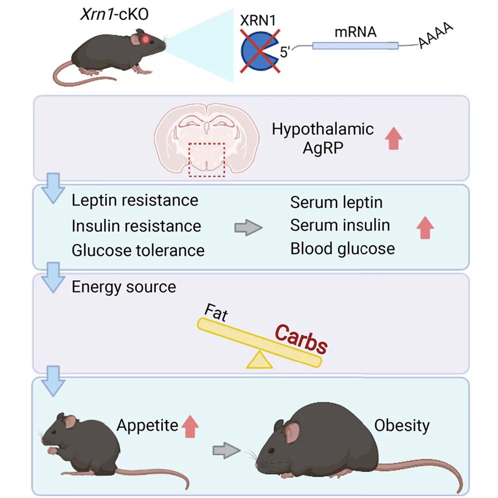 “这个发现非常令人惊讶,”本研究的第一作者Shohei Takaoka博士说道,“当我们在大脑里敲除XRN1时,并不知道我们会发现什么。但这种食欲的暴增是未曾预料到的。”