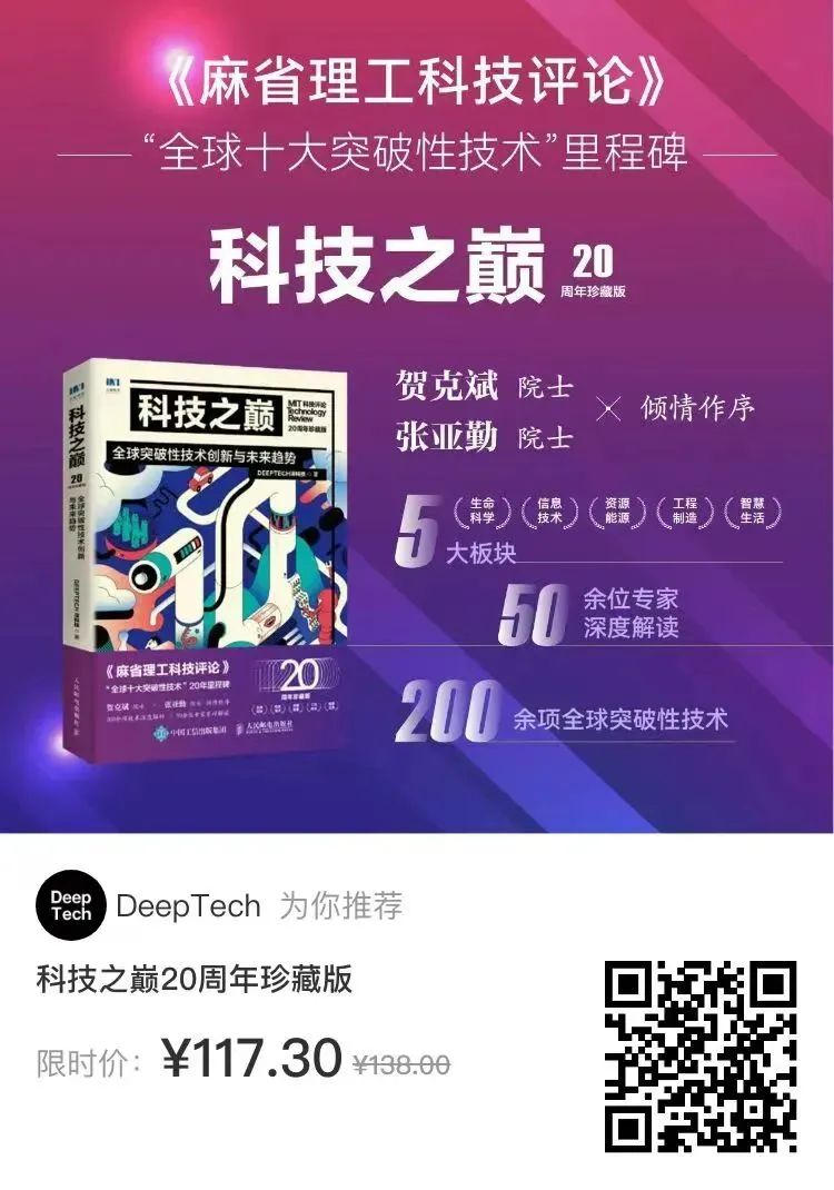 本次峰会将以“科技之巅:新兴科技‘大家’说”为引,围绕“如何加速新兴科技的是产业化与商业化”的话题进行大咖高端对话,并设有“生命科学的无限可能”、“‘碳’索新生态”和“数智新动能”三大板块。同时,整体回顾了过去 20 年来由《麻省理工科技评论》发布的 200 余项“十大突破性技术”的新书