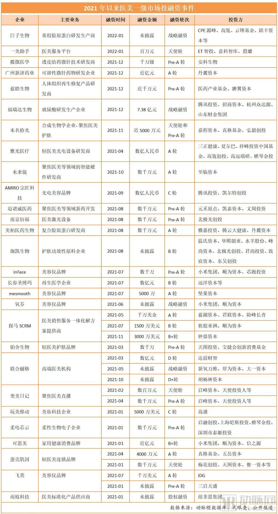 再看一级市场,根据动脉橙数据库数据,2021年到现在我国医美行业共有28家企业完成融资,总吸金额超30亿人民币,创下了历史新纪录。
