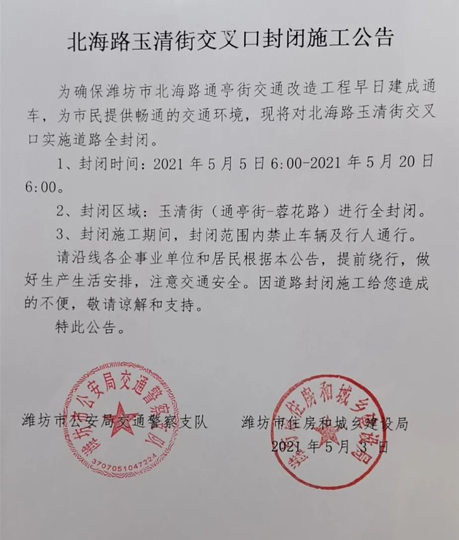 为确保潍坊市北海路通亭街交通改造工程早日建成通车,为市民提供畅通的交通环境,现将对北海路玉清街交叉口实施道路全封闭。