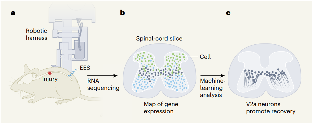 Grégoire Courtine 团队此前还开发了一种分析基因表达数据的机器学习方法,用于识别对生物刺激有反应的细胞类型。Kathe 等人利用这个工具精确定位了腰脊髓中的一种特定类型的兴奋性神经元,在急性和慢性电刺激下都表现出一致而强健的反应性,这些细胞被作者命名为 SC-Vsx2::Hoxa10 神经元。它们是脊椎动物脑干和脊髓中被称为 V2a 神经元的腰椎亚群,这种细胞负责运动和肢体动作的各个方面。目前的研究结果表明,这种细胞类型也可被 EES 激活,并可能在运动恢复中起着关键作用。