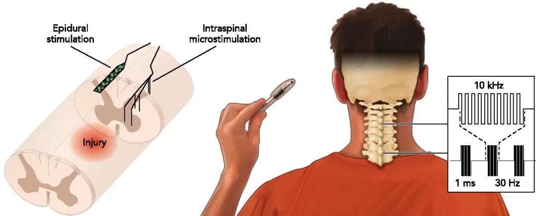 硬膜外电刺激 (EES) 原本是50多年前开始发展起来的一种止痛方法。EES 主要是通过在肌肉和骨骼之下、在脊髓硬脑膜 (包裹神经系统的最外层膜) 的上方植入含有多个电极的柔性垫片。通过电极提供电流就可以激活脊髓附近的神经元,以及传入和传出脊髓的神经元回路。在脊髓损伤的情况下,这种方法也被证明可用于刺激损伤下方存活的神经元并改善伤者的运动功能。