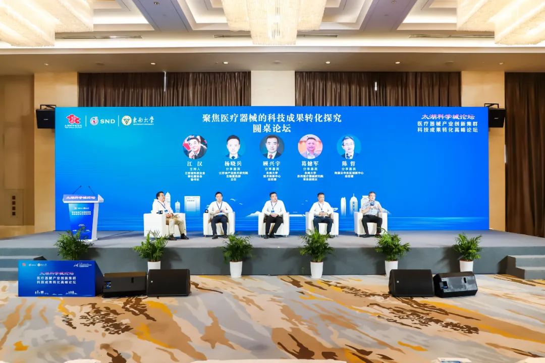 圆桌论坛环节,在江苏省科技企业孵化器协会秘书长江汉的主持下, 江苏省产业技术研究院生物医药部主任杨晓兵等4位专家围绕医疗器械产业领域的科技成果转化,如何更好地促进自主可控的高端医疗装备产业化展开交流与探讨。