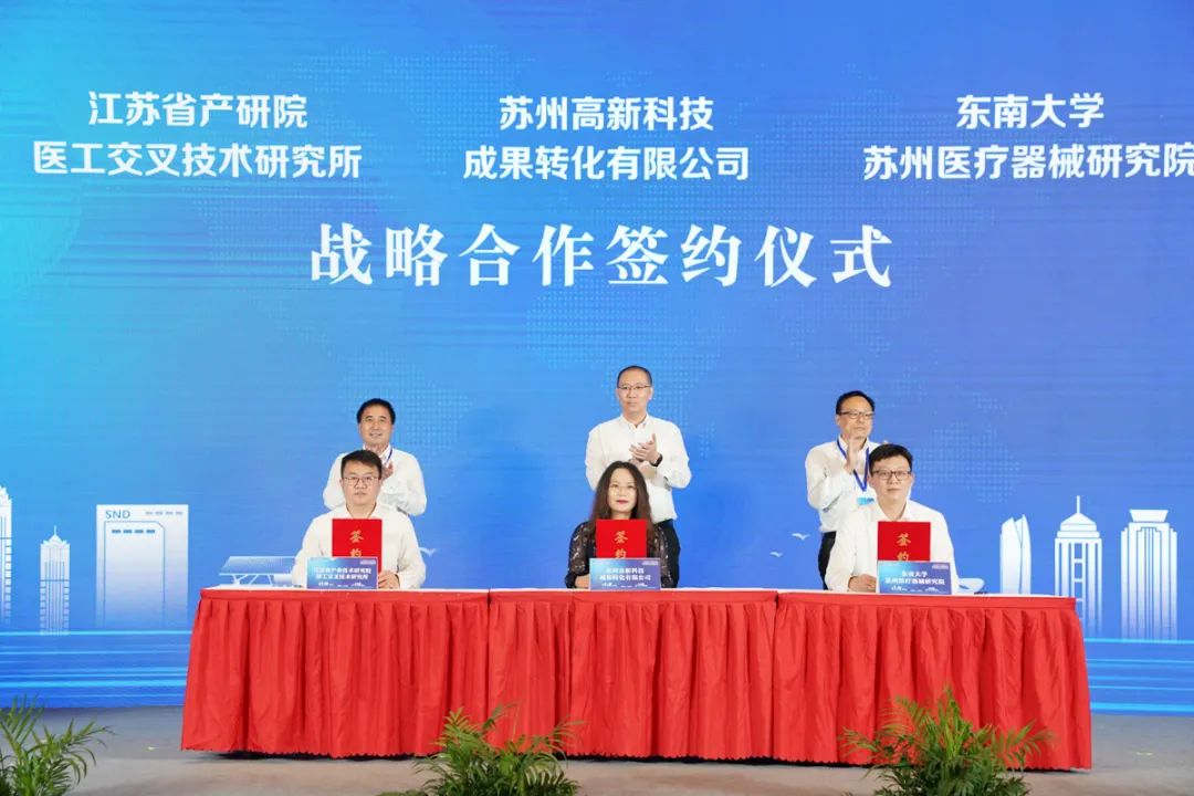 苏州高新区与江苏省医学会进行战略合作签约,苏州高新科技成果转化有限公司、江苏省产业技术研究院医工交叉技术研究所、东南大学苏州医疗器械研究院进行战略合作签约。