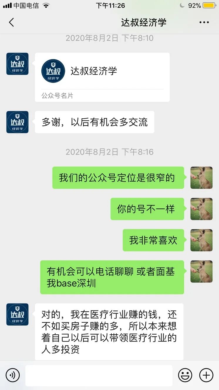 2020年8月2日,达叔加了星哥微信,做了自我介绍,同时把他的公众号达叔经济学推荐给我。星哥看了以后公众号以后,非常喜欢,表示希望有机会见面交流。