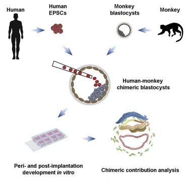 该研究由国内外学者合作开展,于4月15日在《Cell》上发表,题为“Chimeric contribution of human extended pluripotent stem cells to monkey embryos ex vivo”。该研究首次创造出了由人类和猴子细胞组成的胚胎,评估了人类扩展多能性干细胞(hEPCs)在猴子中的嵌合能力。