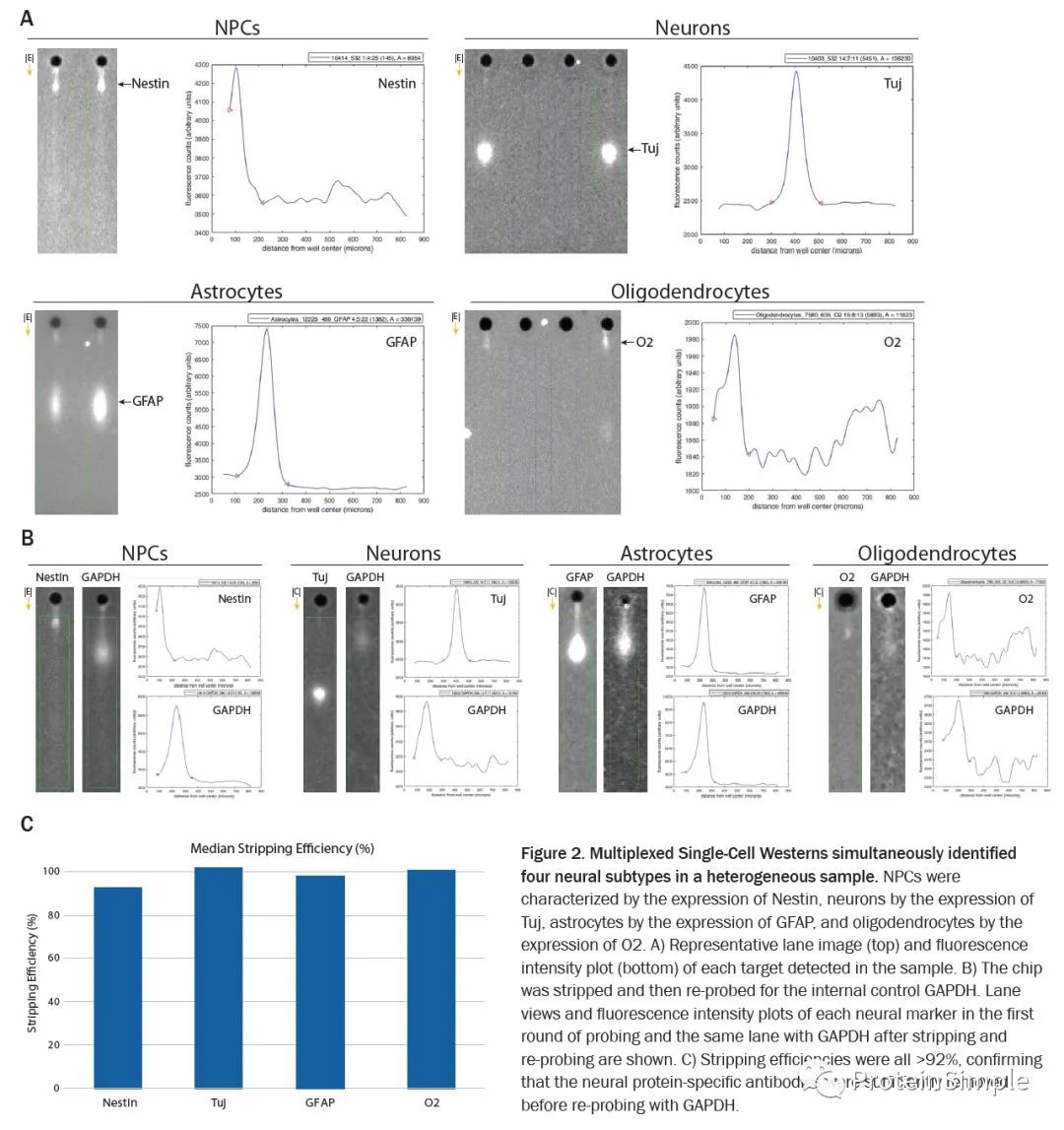多重单细胞蛋白质检测法同时鉴定了每种分化的异质神经样品中的四种主要神经细胞类型(NPC,星形胶质细胞,神经元和少突胶质细胞),以及在原芯片上strip掉蛋白标记,重新进行了GAPDH检测。Milo可同时检测芯片strip效率(剥离效率均高于92%)。