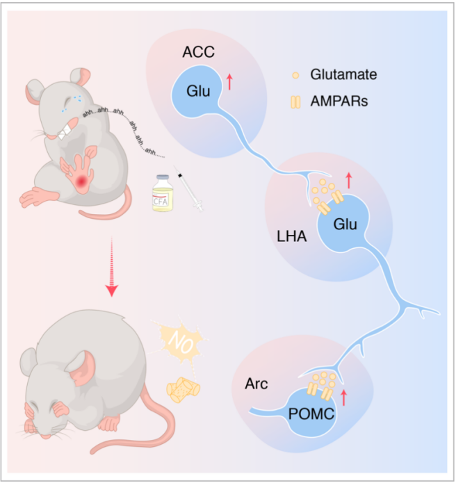 —调控摄食的关键脑区和神经细胞,特异性抑制GluACC→GluLHA→POMCArc神经环路活性可显著缓解由疼痛引起的进食减少和动机减弱。总的来说,本研究显示GluACC→GluLHA→POMCArc神经环路参与驱动疼痛状态下的食欲不振。