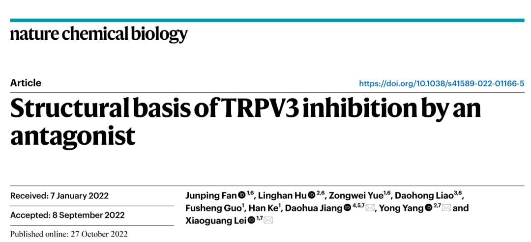 的论文。揭示了靶向TRPV3离子通道蛋白小分子抑制剂的作用机制,并证实它具有治疗多种皮肤疾病的潜能。
