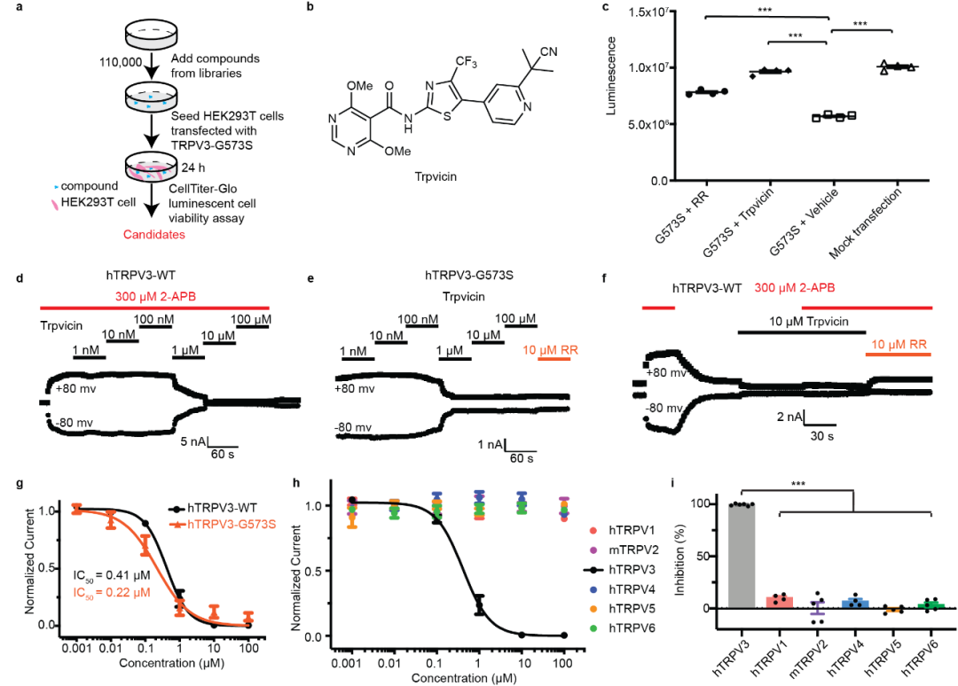 在该研究中,作者发现外源过表达致病突变体TRPV3_G573S会导致细胞死亡,并利用这一现象进行了小分子抑制剂的高通量筛选。通过筛选包含11万个化合物的分子库,作者最终鉴定出化合物Trpvicin是一种高亲和力TRPV3 拮抗剂