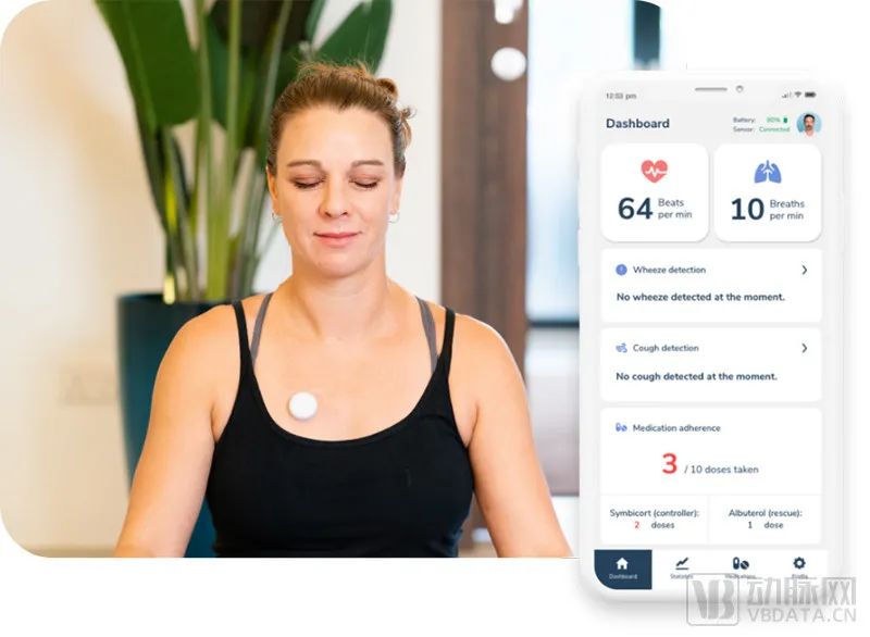 这款智能可穿戴听诊器可检测哮喘和COPD等疾病的异常肺音,并将测量值(呼吸频率、心率和喘息)记录到患者手机app中,通过人工智能分析跟踪并预测疾病是否恶化。此外,它还可以用于远程诊断,以虚拟听诊器的形式为医生记录和回放胸部声音,并提供相应的数据参考,为医生决策提供参考。