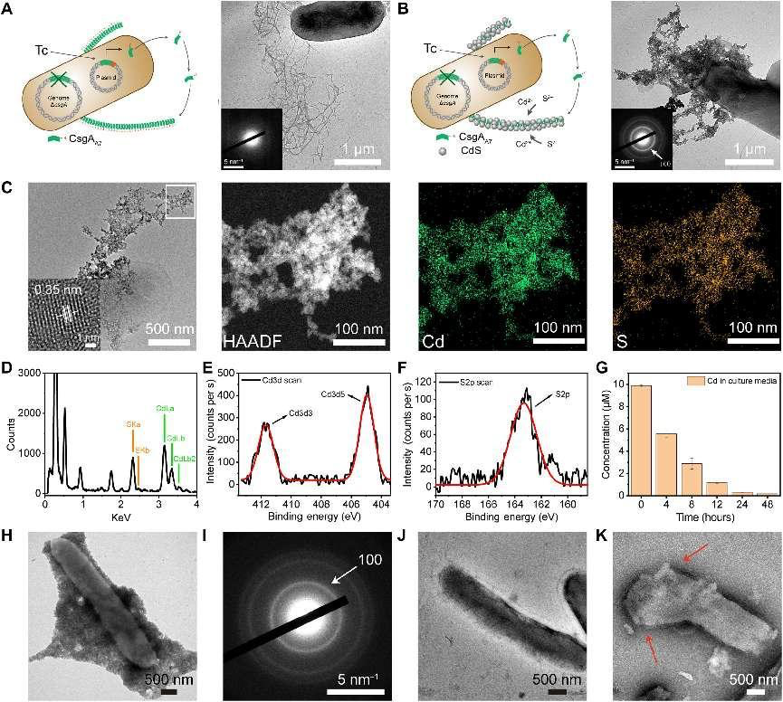 研究中,团队利用生物被膜展示的功能短肽直接诱导硫化镉半导纳米材料在生物被膜表面沉积,避免其沉积到细胞膜表面。