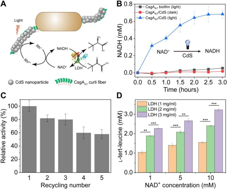 这些光催化剂矿化生物膜表现出高效的光电响应,并被进一步开发用于多种光催化反应系统。经过 5 个循环的光催化 NADH(Nicotinamide adenine dinucleotide,还原型辅酶Ⅰ)再生反应,生物被膜可持续循环利用。