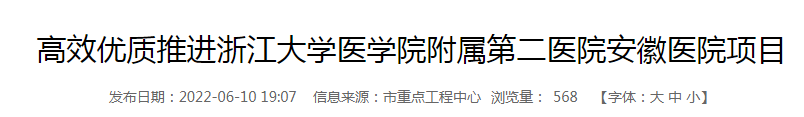 浙江大学医学院附属第二医院安徽医院项目总建筑面积15万平方米,项目建设用地面积135亩,建设床位1000张,计划总投资13亿元。计划5年内打造成为现代化高水平肿瘤专科医院。建设内容包括门急诊、医技中心、肿瘤住院中心、肿瘤研究中心等;项目建成后,将实现优质医疗资源下沉,促进区域间医疗服务同质化,极大满足市民就近高水平医疗需求。